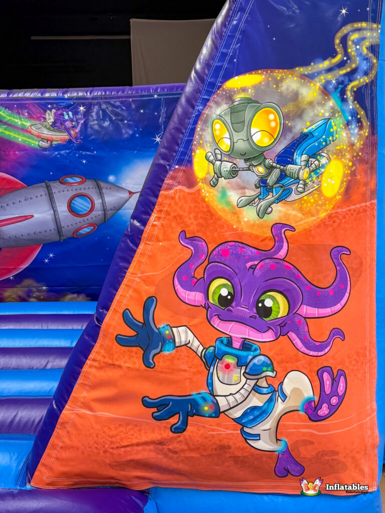This premium inflatable combines the thrill of a large bouncing castle with the excitement of an attached slide, offering non-stop play and guaranteed engagement thanks to its vibrant, high-quality space artwork.