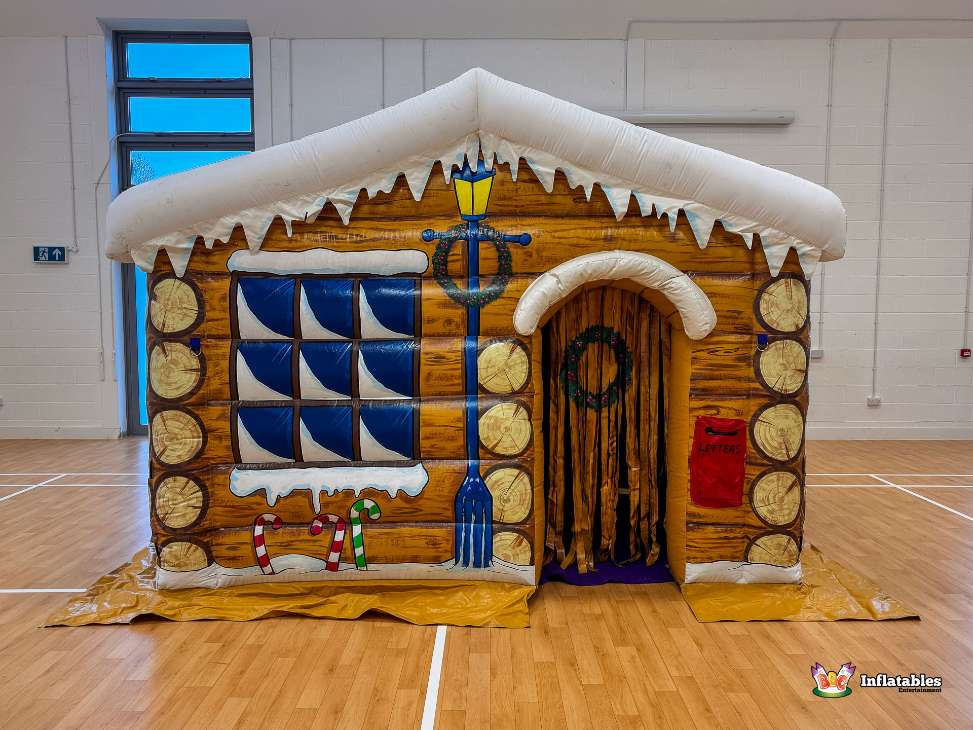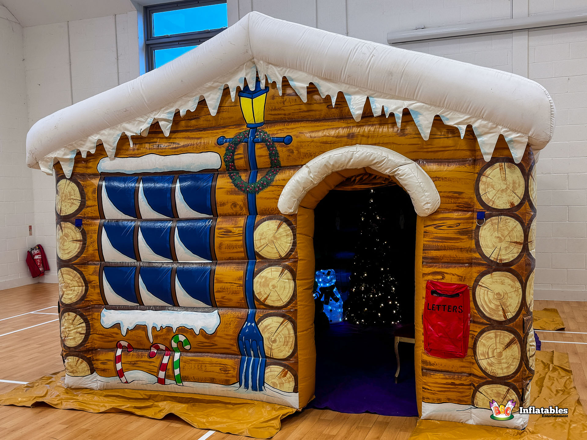 - The interior features an inflatable Stone Fireplace backdrop, soft plush flooring, and delightful prop presents and light-up figures (including Santa and snowmen) to complete the enchanting scene.