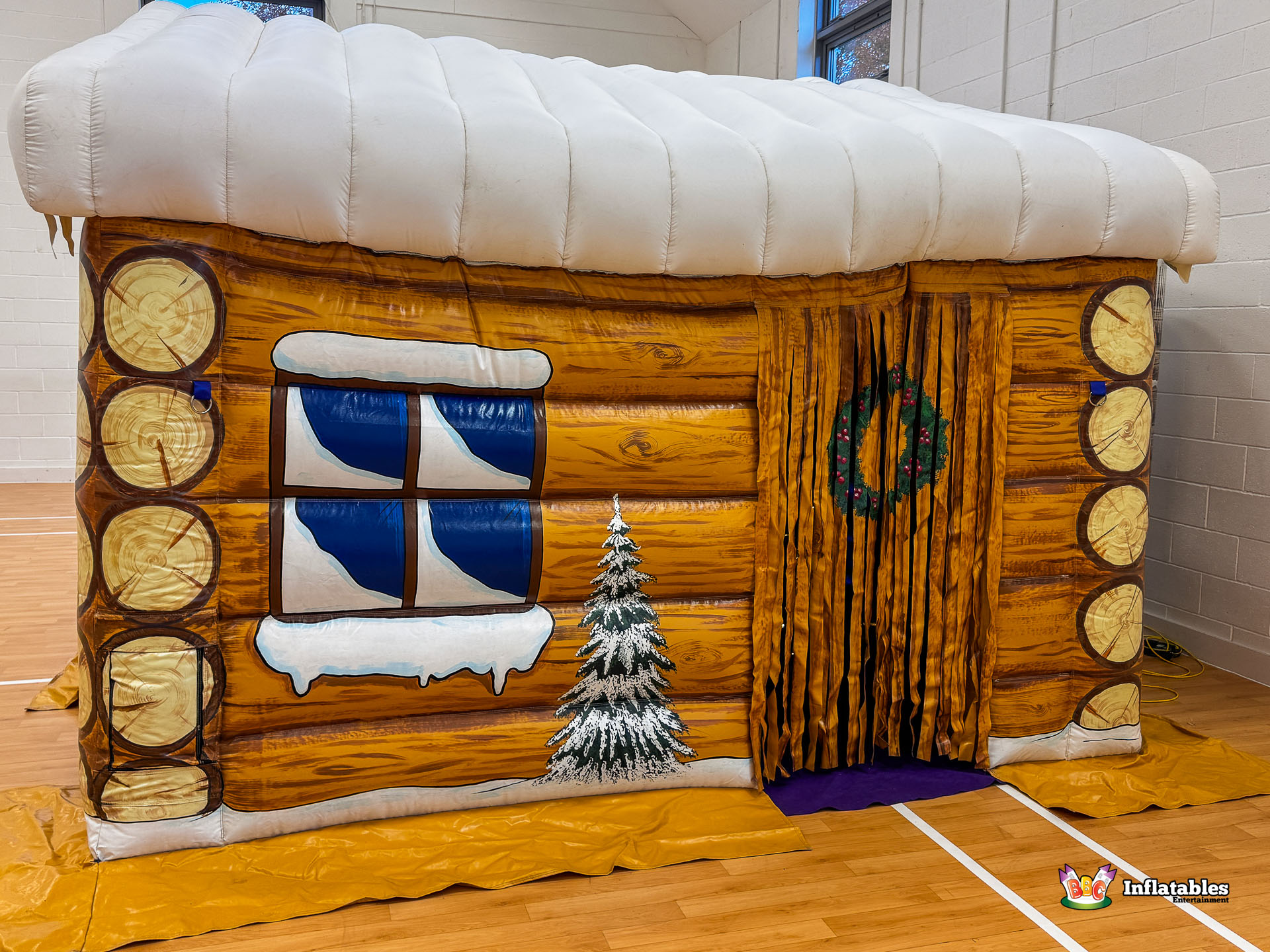 - Authentic Log Cabin Look: The inflatable structure features a highly realistic wooden log cabin aesthetic with detailed printed "wood slices," a heavy white snowy roofline with icicles, and charming window illustrations.