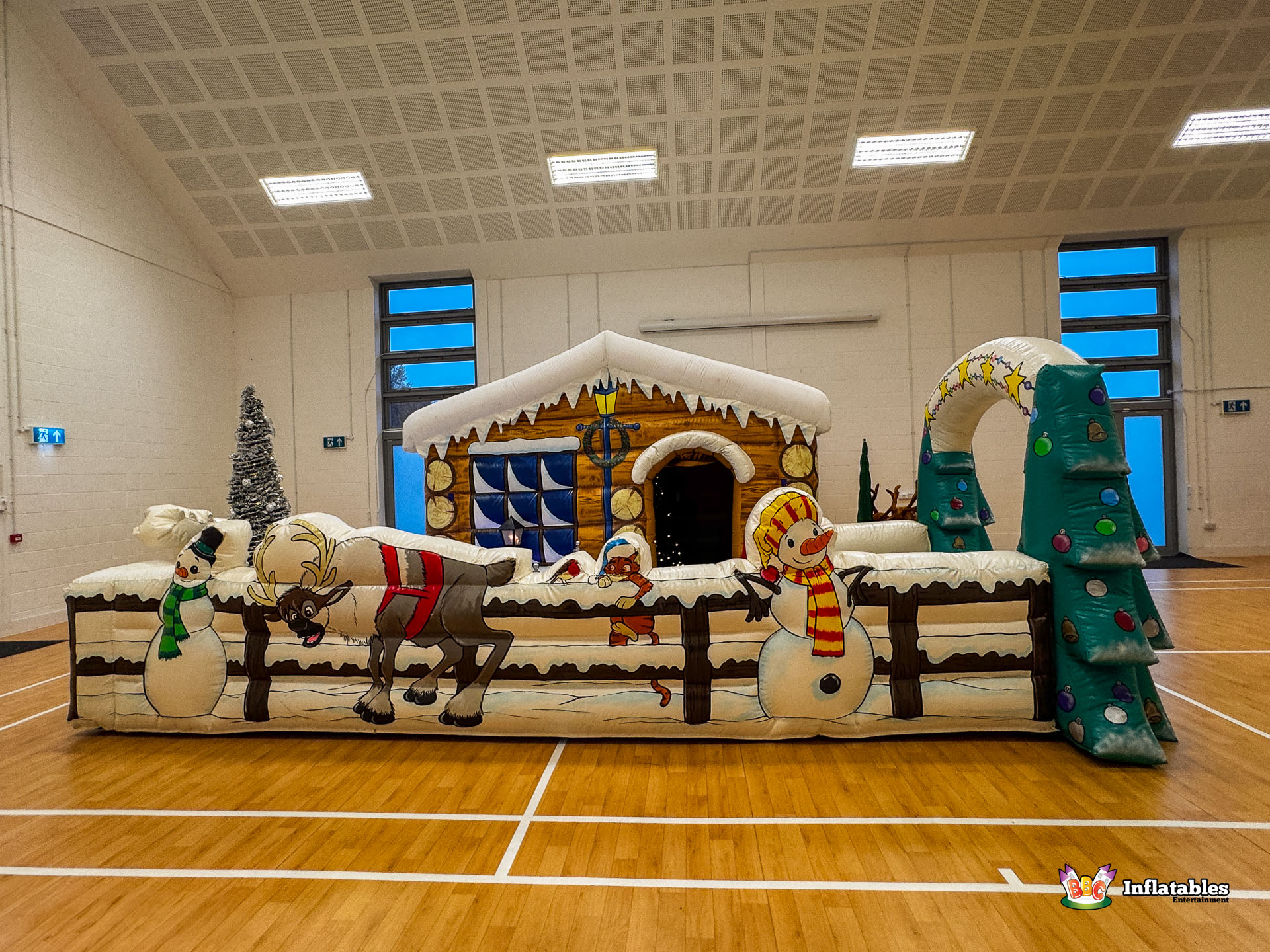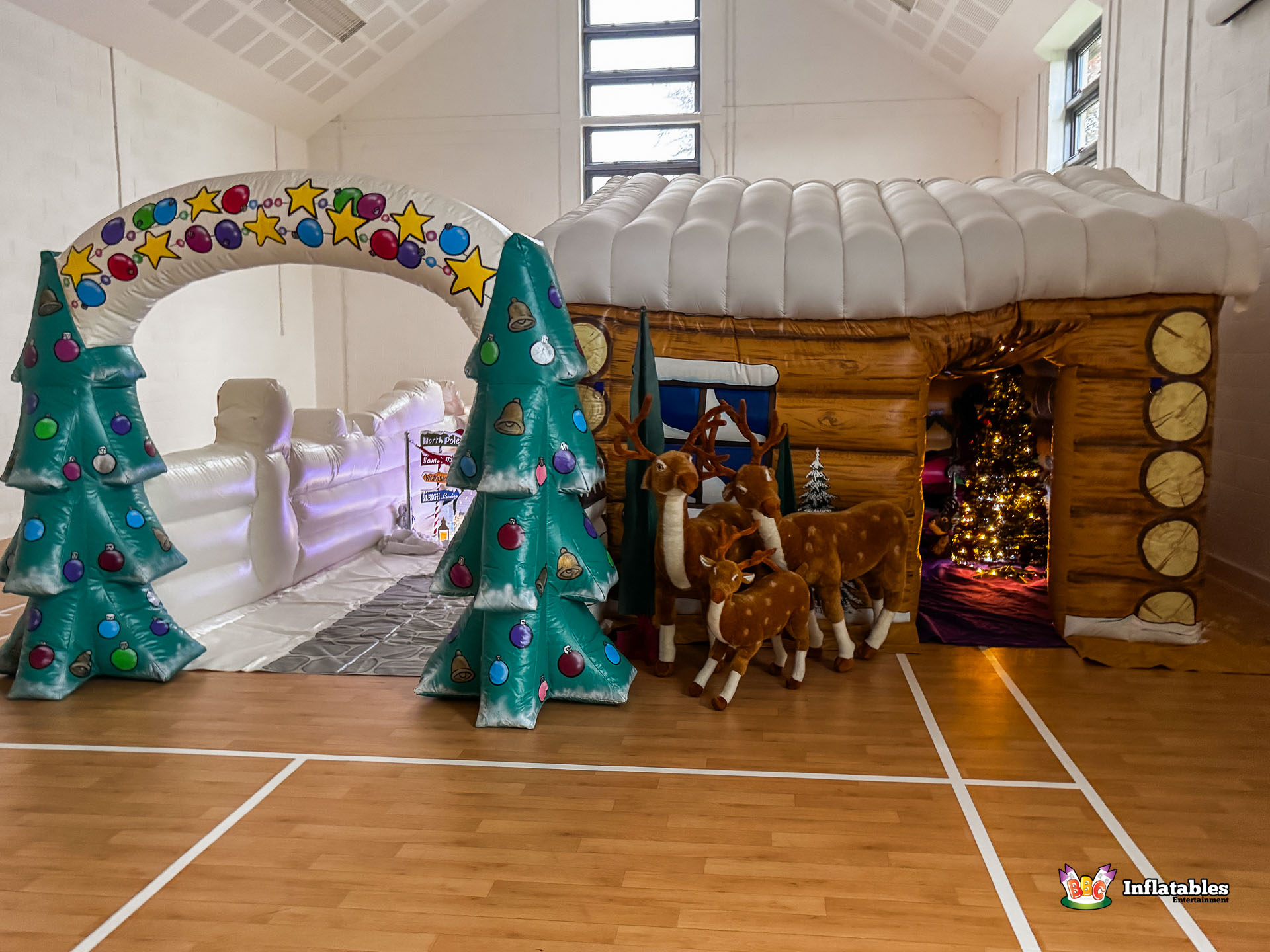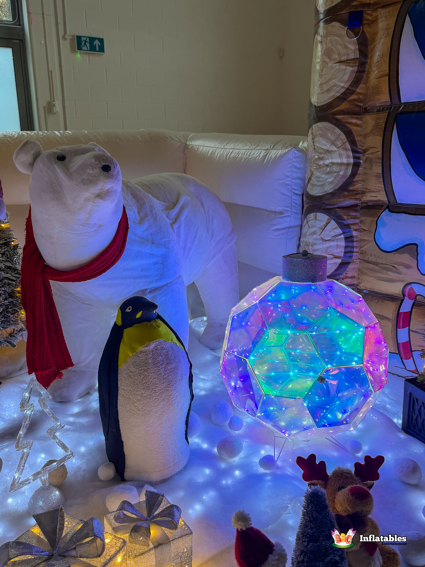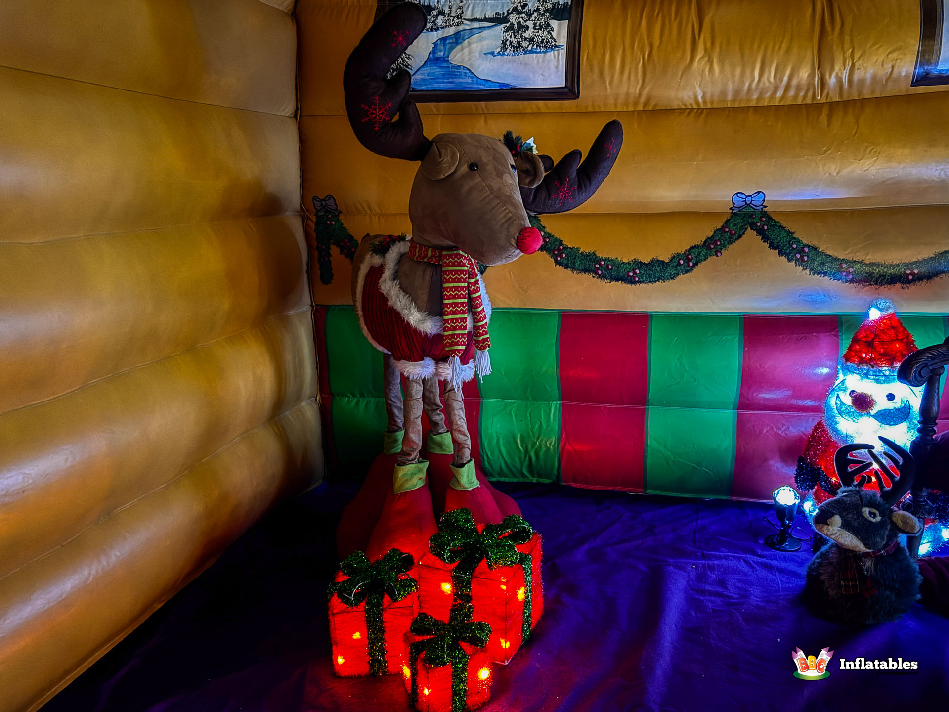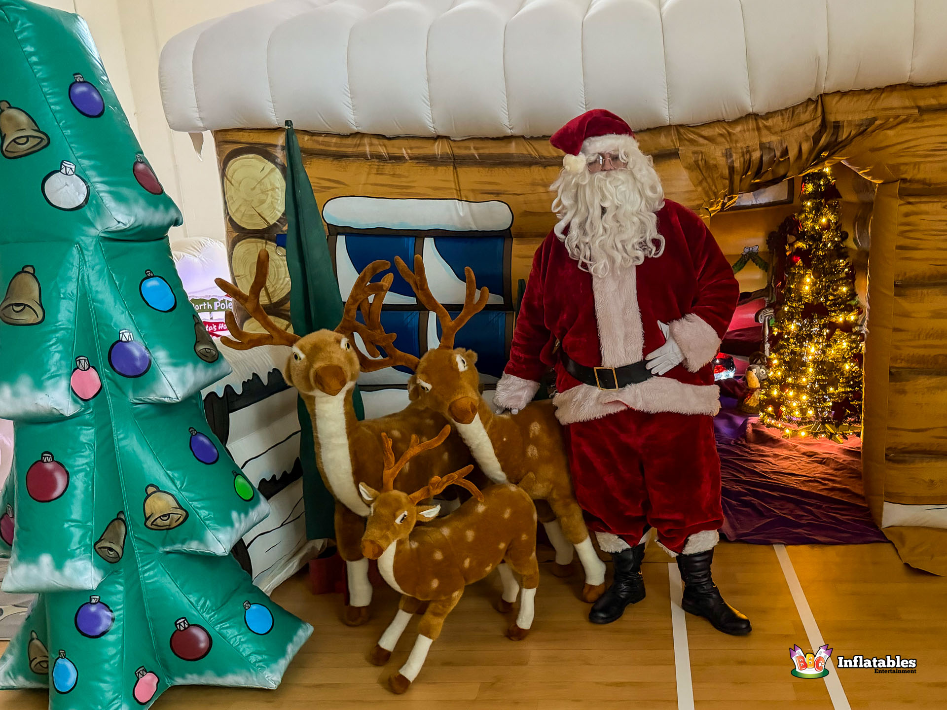 - The Setting: The interior features an inflatable Stone Fireplace backdrop and prop figures (reindeer, snowmen) to complete the enchanting scene.