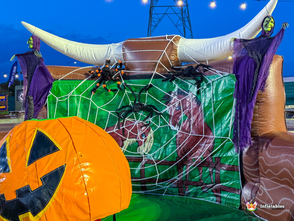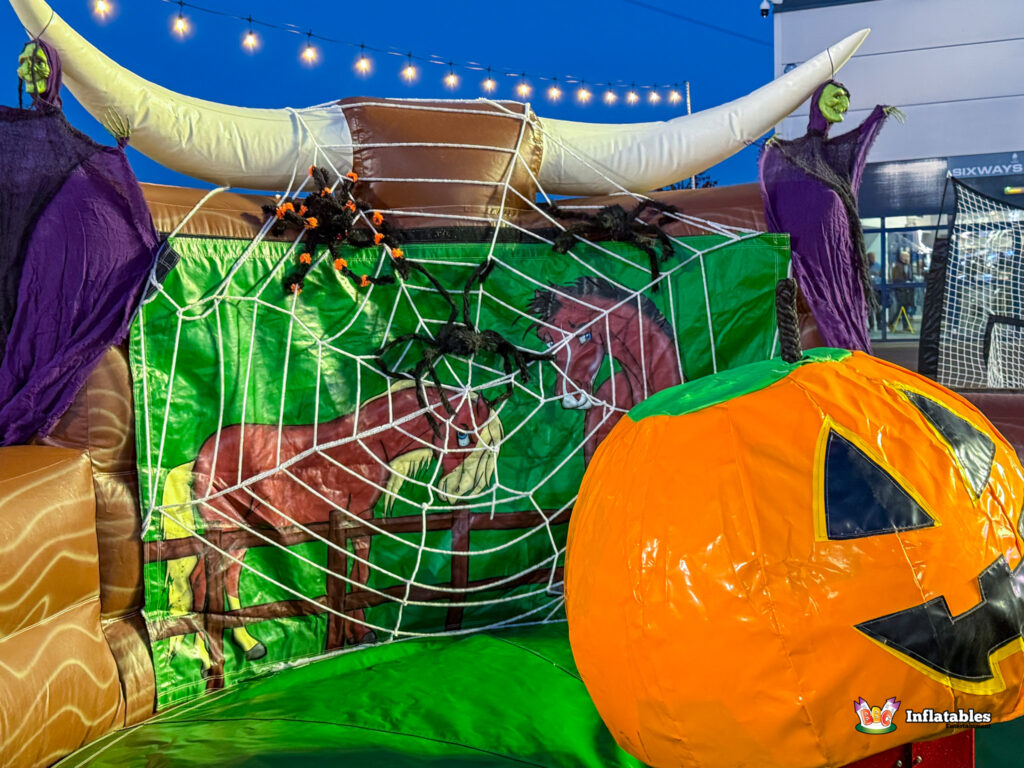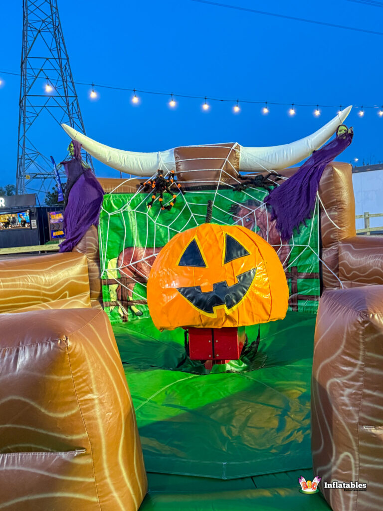 - Unique Theming: Features a giant, grinning Jack-o'-Lantern Pumpkin at its core, surrounded by an impressive, realistic log and spiderweb-themed inflatable surround.