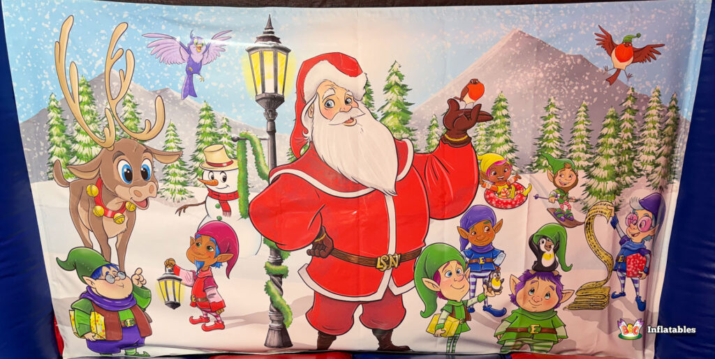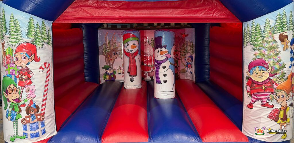 Inside the main bouncing arena, the magic continues! The back wall displays a grand tableau: the man himself, Santa Claus, stands proudly beside his loyal Reindeer, surrounded by a team of busy, joyful Elves prepping gifts by a glowing lamppost. Adding to the fun are two fantastic Snowman Biff-Bash Wobblers—one with a cheerful red scarf and the other rocking a purple top hat—ready for a friendly, bouncy snowball fight! This stunning, high-definition artwork guarantees a fully immersive and memorable Christmas experience.