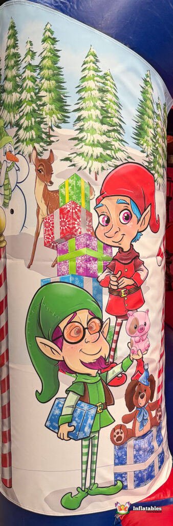 The exterior side pillars feature a flurry of festive activity: cheerful Elves are busy with gifts, accompanied by friendly deer, snowmen, and candy-cane stripes. Look up at the front banner and you'll catch a playful Elf sledding alongside a hilarious Snowman that's catching a ride on a shovel!